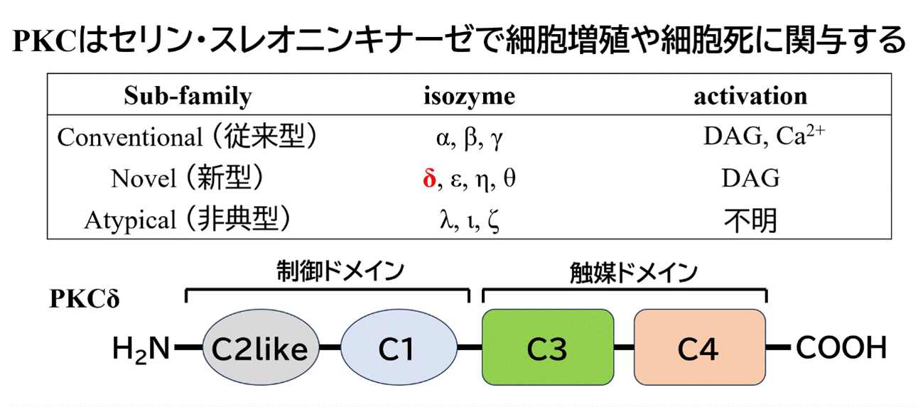 近年は、糖尿病における細小血管障害、耐糖能異常、膵β細胞死、膵α細胞からのグルカゴン分泌に、Protein kinase C (PKC) δの関与が注目されている。PKCδはnovel PKCに属し、細胞増殖・分化・アポトーシスに関与する分子であり、糖尿病マウスでは網膜症や腎症の進展に関与することが報告されている。