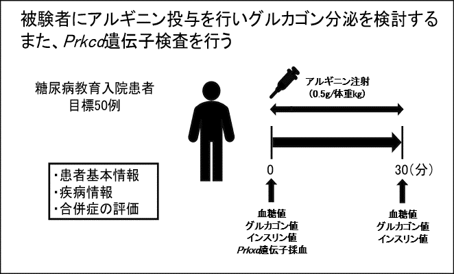 被験者は50人を目標に糖尿病教育入院患者に対し、アルギニン負荷試験を行い、グルカゴン分泌に差があるかどうかの確認を行っている。